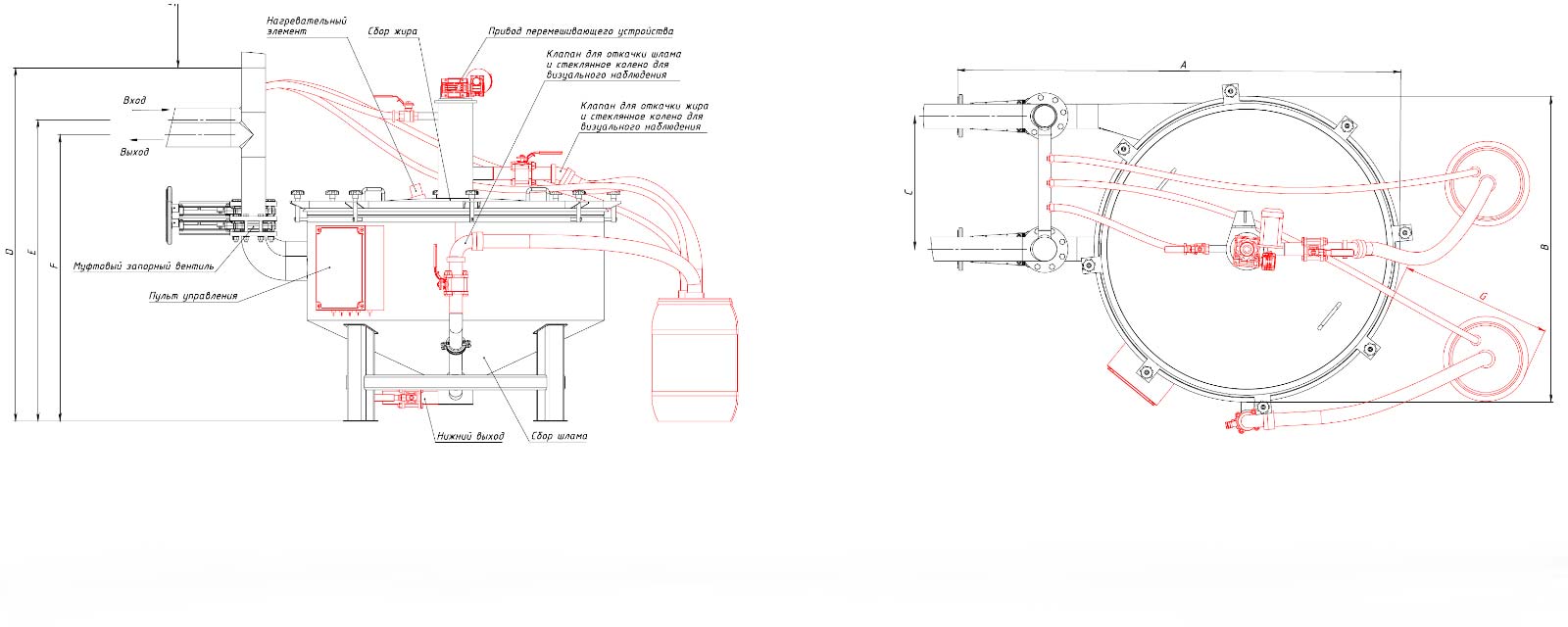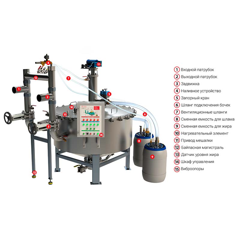 - Шаровые краны DN 50 для отвода жира и шлама;