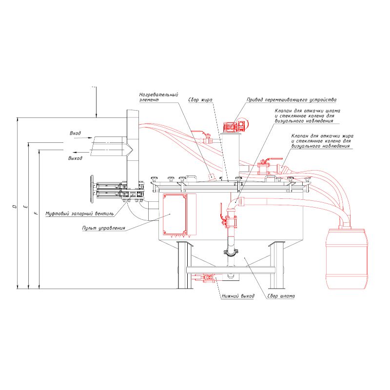 - Шаровые краны DN 50 для отвода жира и шлама;